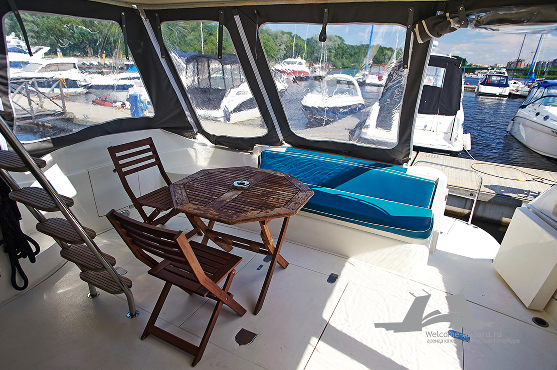 Яхта рассчитана на компанию до 14 человек! Аренда от одного часа!!! По всем возникшим у вас вопросам будем рады ответить по телефону (812)980-980-8! Длина 19 м, ширина 5 м, высота 4,4 м, осадка 1,6 м, скорость хода до 35 узлов.